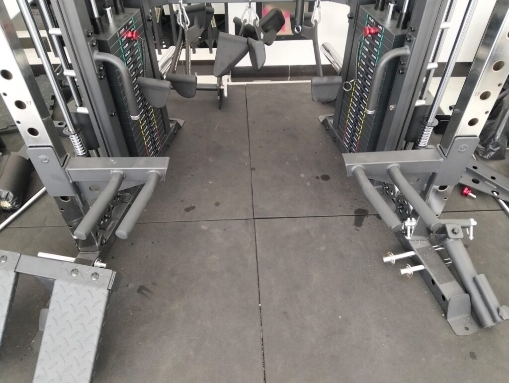 Pasang Dips di lubang paling bawah, posisikan juga Smith Machine setinggi kepala untuk pegangan sebelum meraih Pull Up Bar.